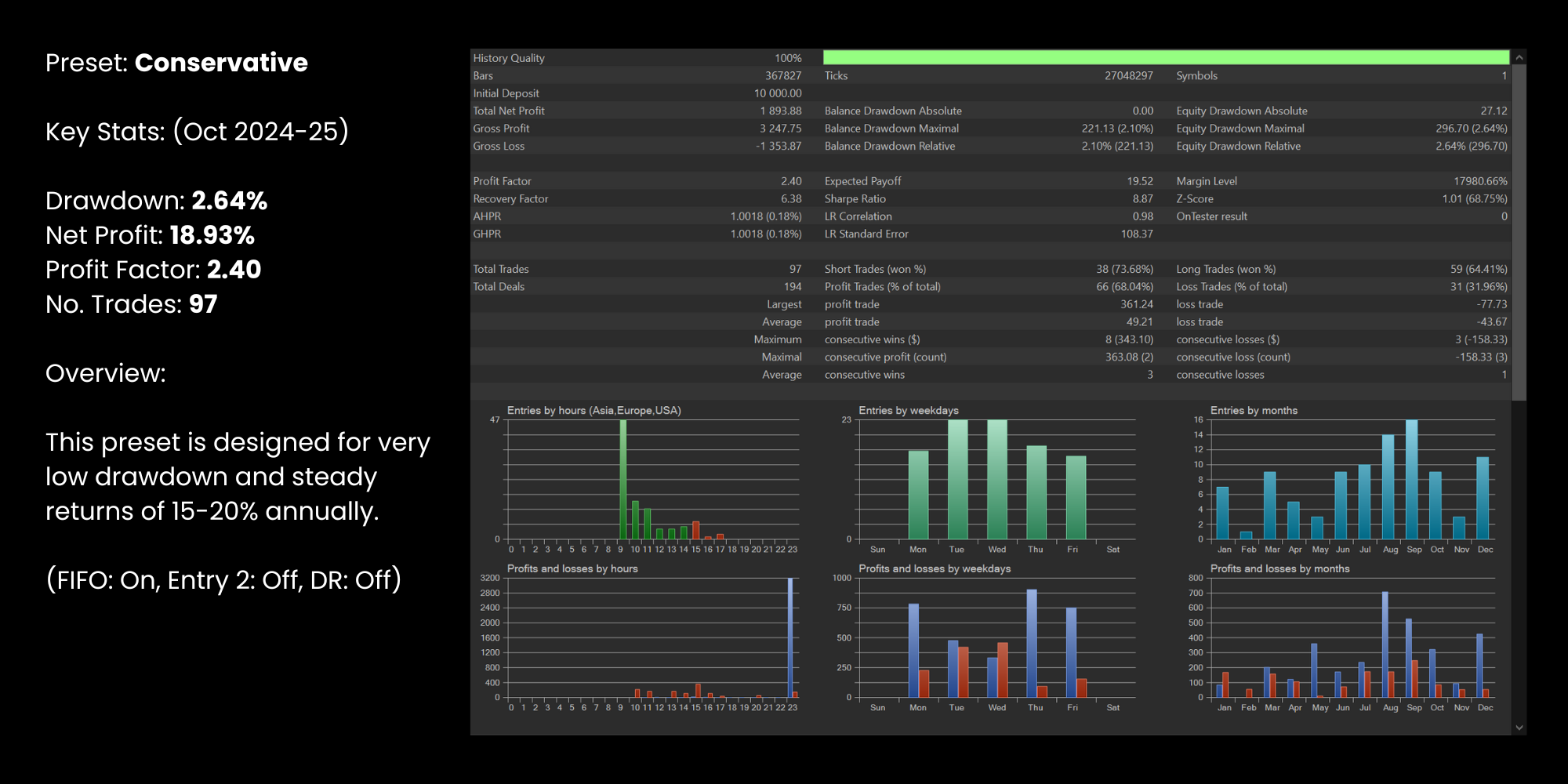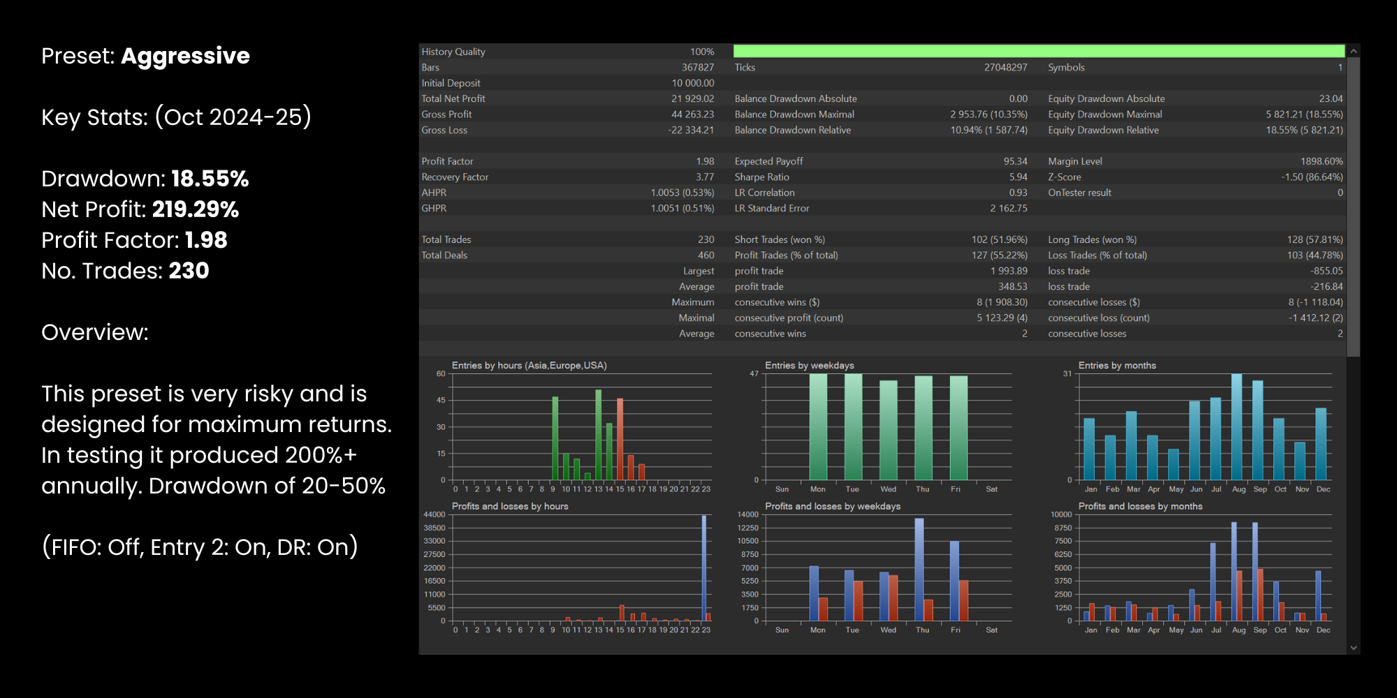 BlakBox applies a proven trading edge with built‑in risk management, backed by 10 years of profitable backtests and live performance. The Dynamic Risk feature adjusts position sizing based on setup quality.