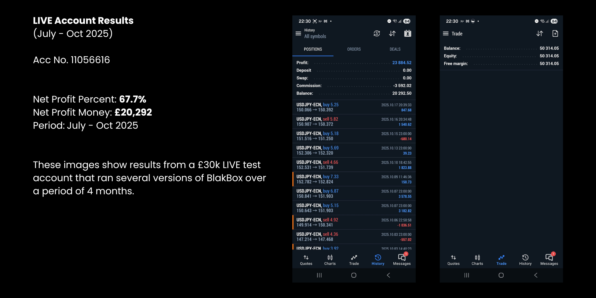 Every trading system carries risk. BlakBox is designed with strict risk controls, and you can choose from preset files or set your own risk levels. Never trade with money you can't afford to lose.