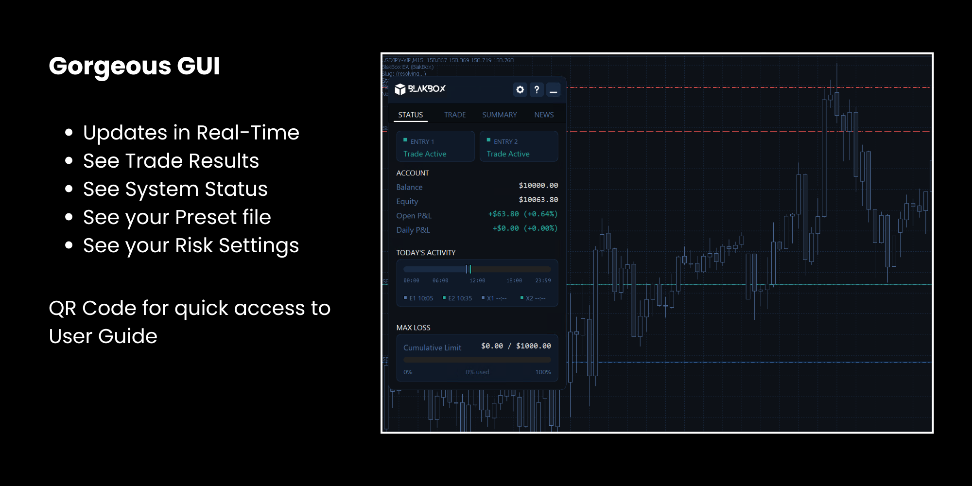 Every trading system carries risk. BlakBox is designed with strict risk controls, and you can choose from preset files or set your own risk levels. Never trade with money you can't afford to lose.